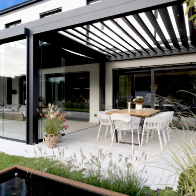 Ein Lamellendach verbindet mediterranes Flair mit flexibler Verschattung. Die Aluminiumlamellen lassen sich individuell einstellen – von vollständig geöffnet bis regendicht geschlossen. So entsteht ein geschützter Freisitz, der auch hohen Schnee- und Windlasten standhält.