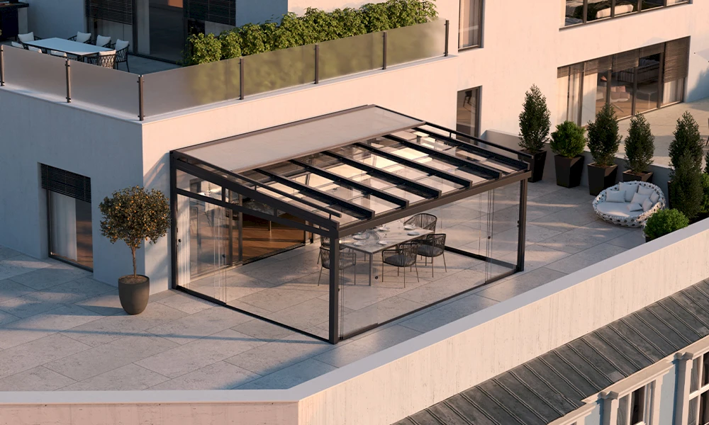 Terrassendächer, Sommer- und Wintergärten schaffen Räume im Freien – aber erst mit einem wirksamen Sonnenschutz und der passenden Belüftung fühlen sich die Nutzer hier wohl.
