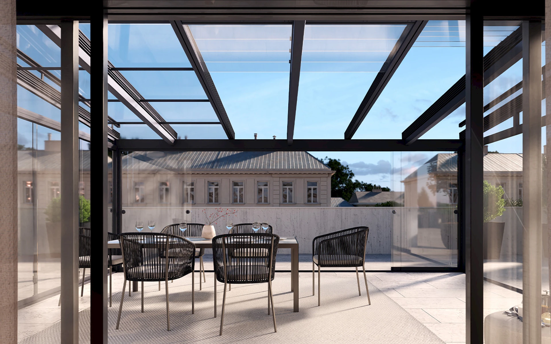 Unser Glas-Schiebe-Dach verbindet transparenten Wetterschutz mit maximaler Flexibilität. Die verschiebbaren Glaselemente lassen sich je nach Wetterlage öffnen oder schließen und schaffen so einen geschützten Außenbereich mit viel Licht und Offenheit. Hochwertig verarbeitet und präzise geplant – für eine Terrasse, die sich Ihrem Leben anpasst.