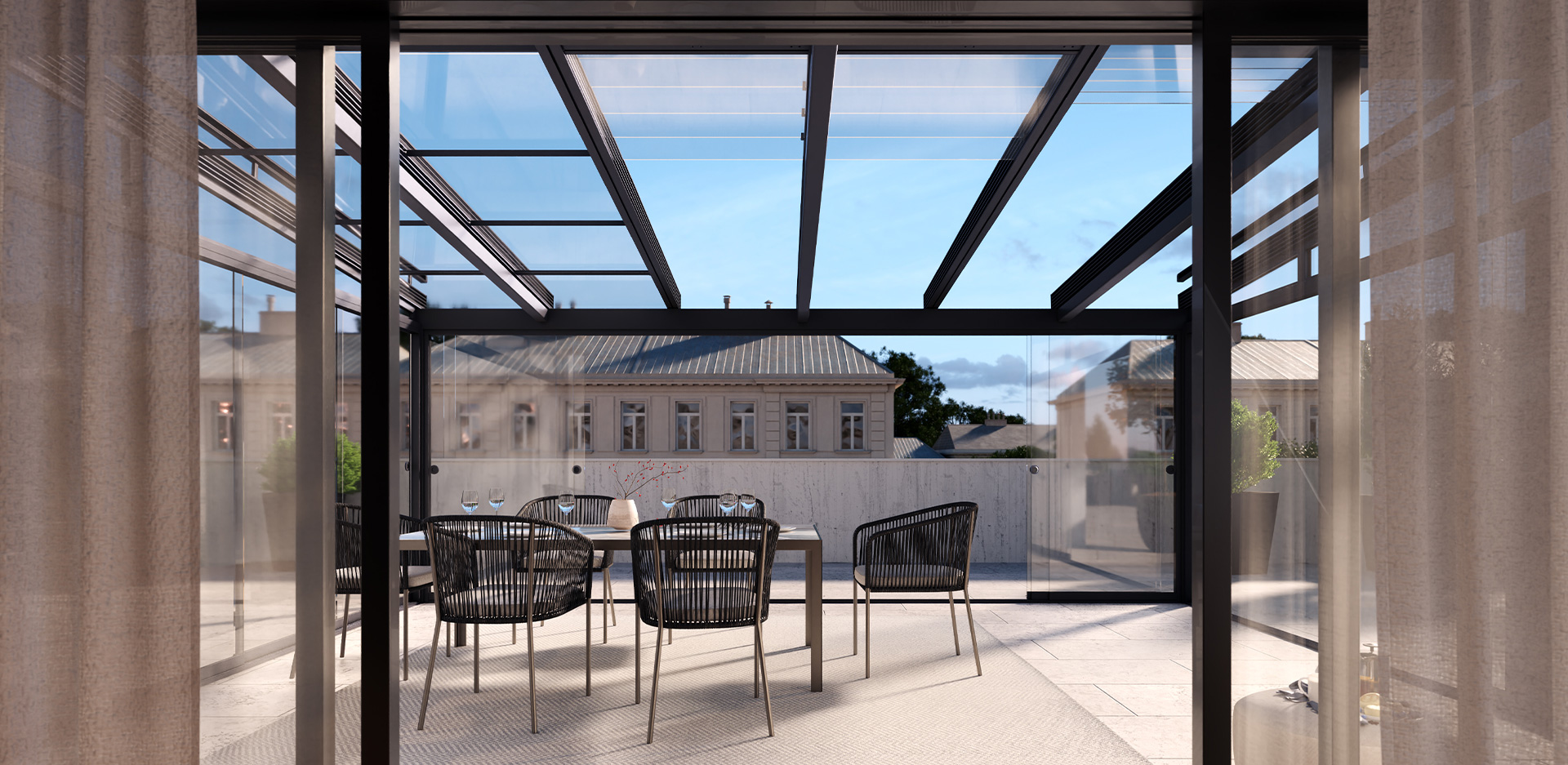 Im geschlossenen Zustand bildet das System ein stabiles, regendichtes Glasdach für die Terrasse. Bei geöffnetem Dach entsteht ein luftiger, offener Raum mit direkter Verbindung zur Natur.