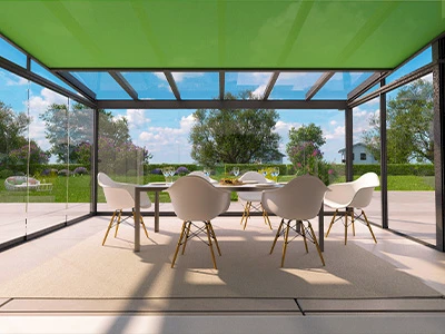 Auf Wunsch statten wir SunChill® mit einer hochwertigen Überglas- oder Unterglas-Markise aus. Sie haben die Wahl zwischen den Trendfarben Grün, Rot und zahlreichen edlen Anthrazit-Tönen.